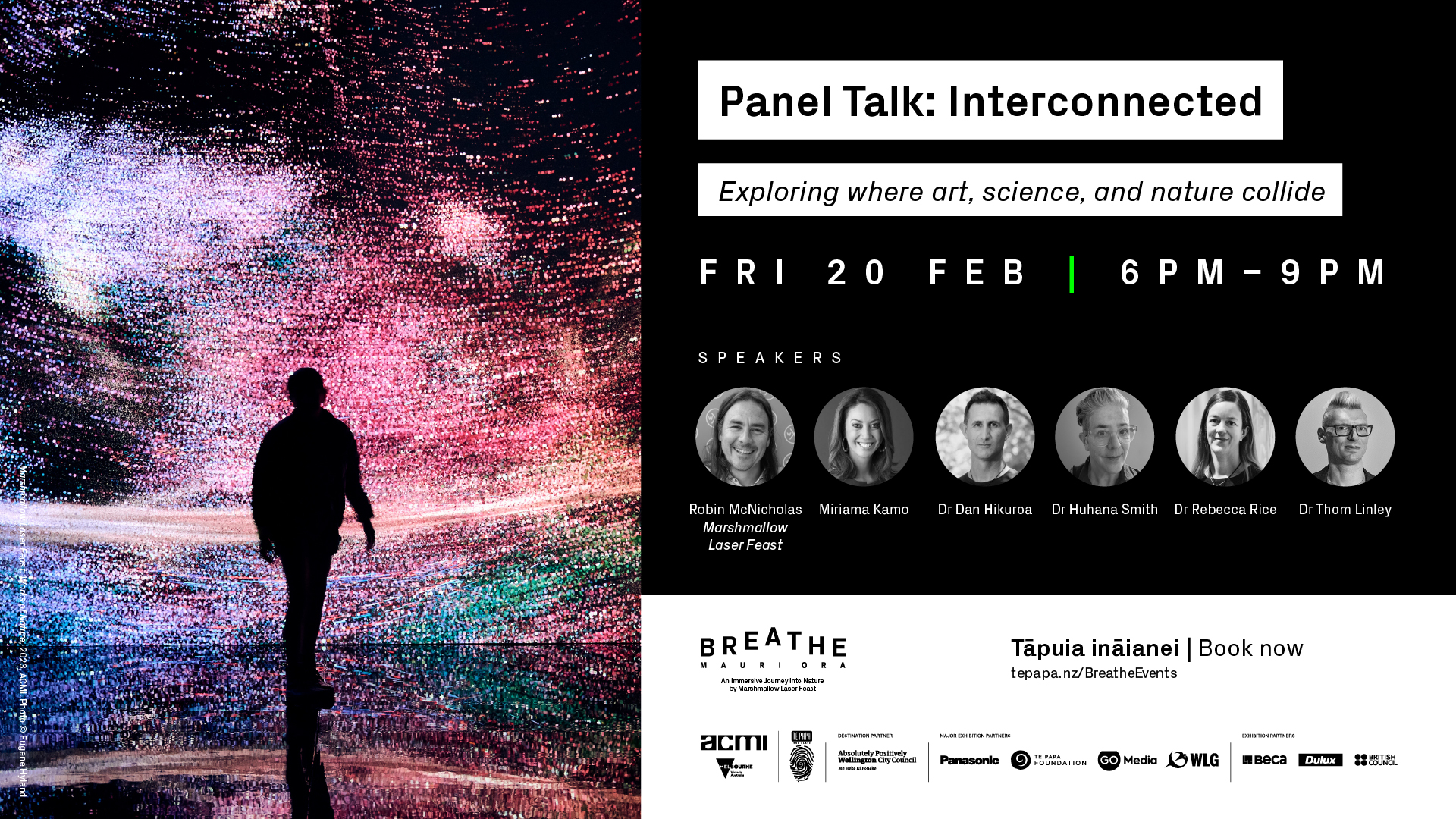 Hosted by Miriama Kamo, Interconnected brings the relationships of art, science, nature, and mātauranga to life in a panel discussion. London-based art collective Marshmallow Laser Feast joins leading researchers and curators for an evening of sharing how we understand the world and ourselves, inspired by Breathe | Mauri Ora.